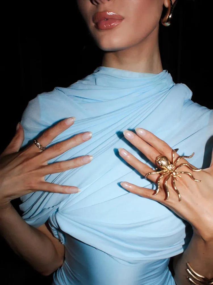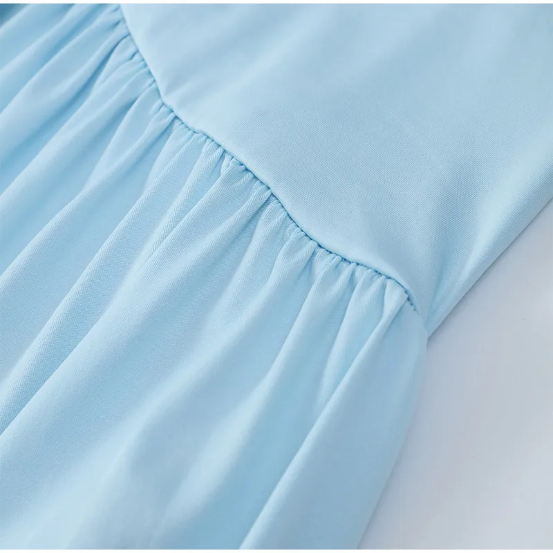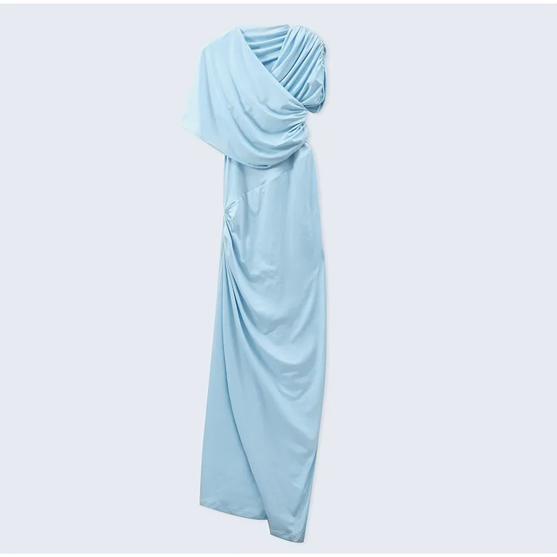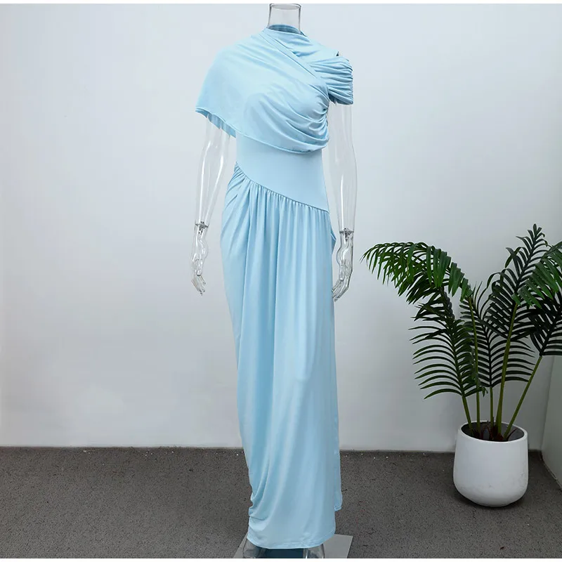 Model Number: Irregular Shawl Blue Pleated Long Dress